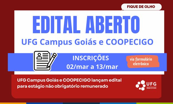 A Universidade Federal de Goiás – Campus Goiás, por meio da Coordenação de Graduação, em parceria com a Cooperativa de Ensino da Cidade de Goiás LTDA (COOPECIGO), publicou o Edital nº 01/2026 para seleção de bolsistas de estágio não obrigatório remunerado.